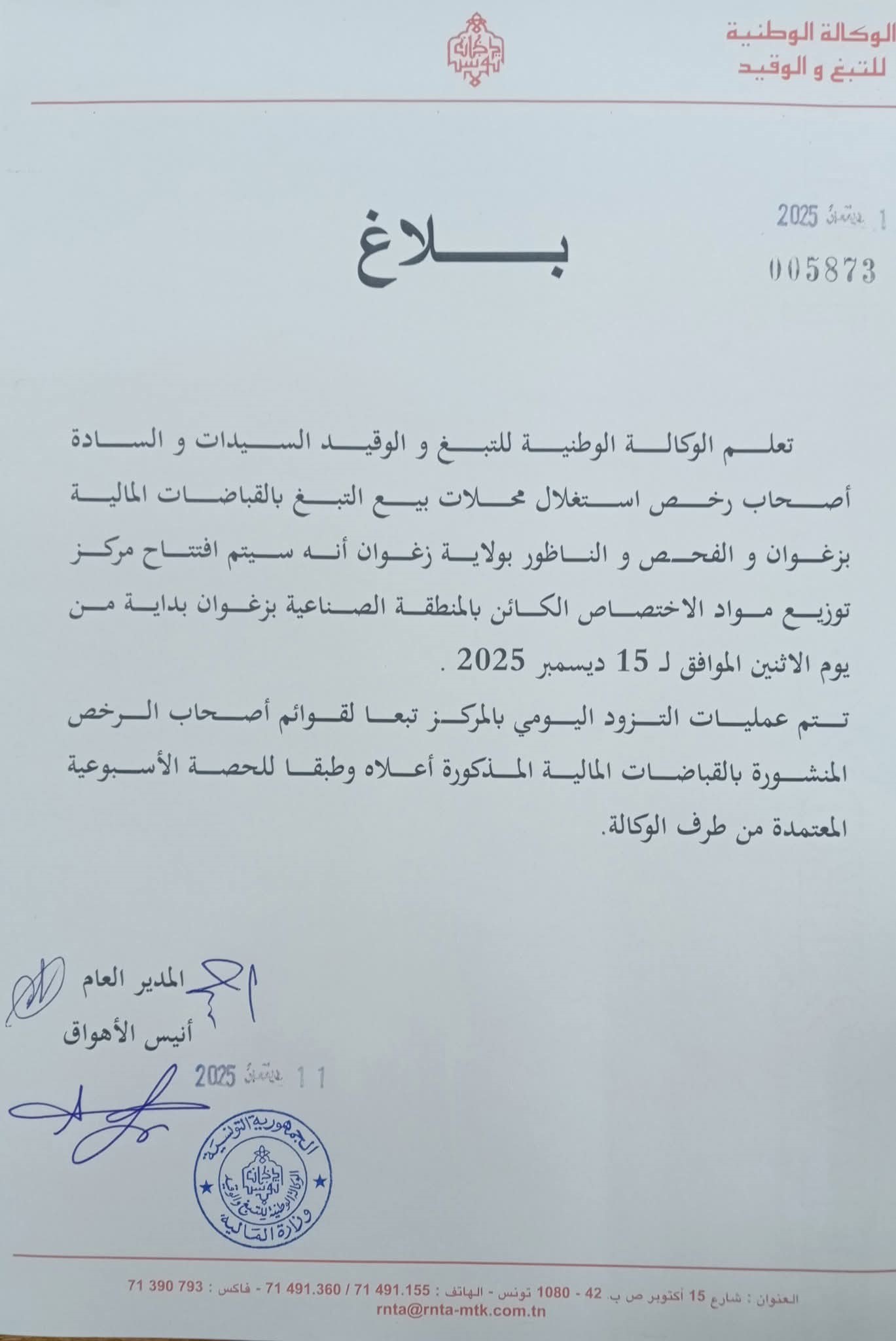 وتؤكد الوكالة الوطنية للتبغ والوقيد التزامها الدائم بدعم منظومة التوزيع الوطنية وضمان استمرارية توفير المواد الأساسية للحرفاء وفق أعلى معايير الجودة والاحترافية بما ينسجم مع توجه الدولة لتعزيز الخدمات العمومية في مختلف جهات الجمهورية.