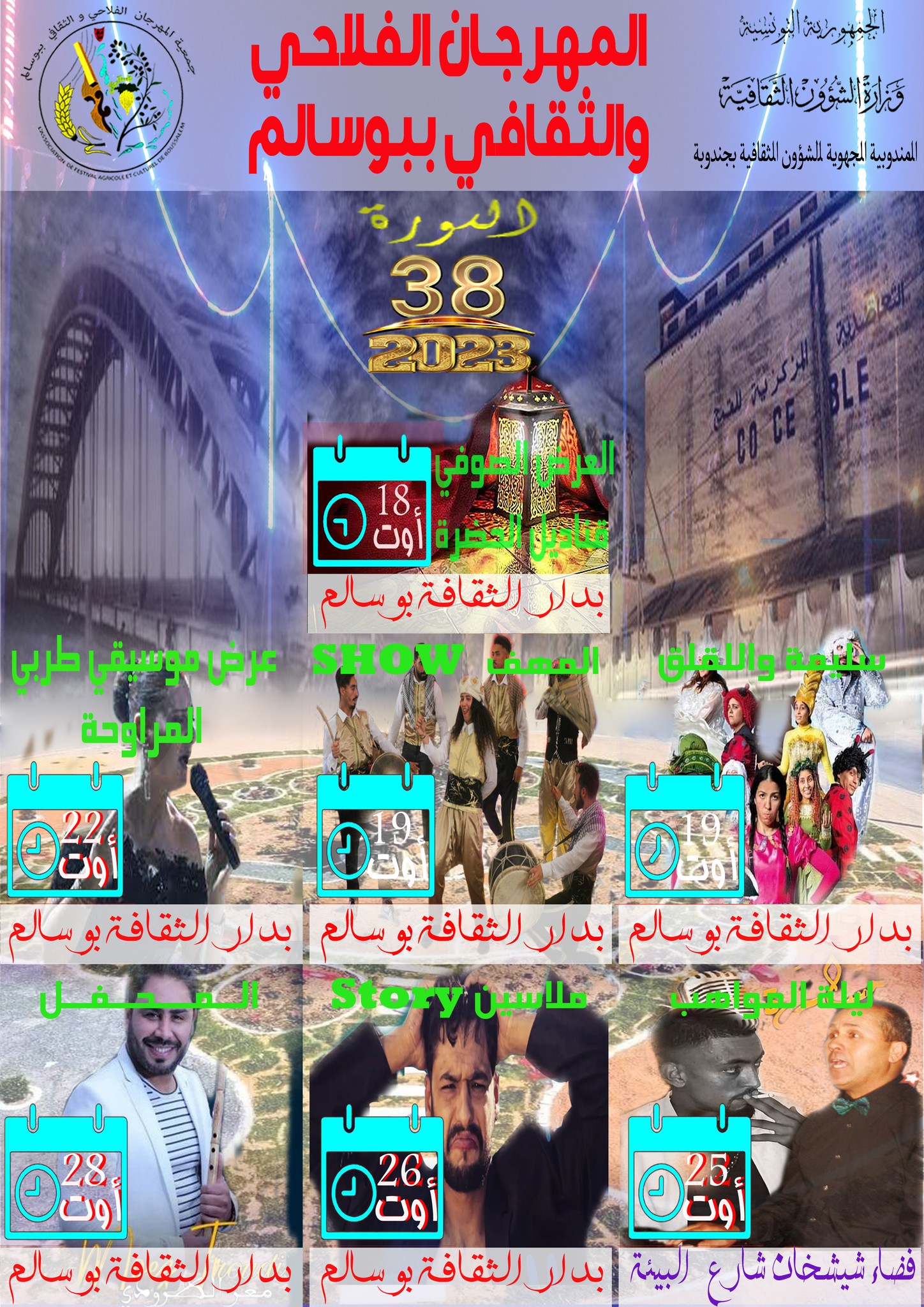 تعيش منطقة بوسالم من ولاية جندوبة خلال الفترة من 18 إلى 28 أوت الجاري على ايقاع فعاليات الدورة 38 للمهرجان الفلاحي والثقافي والذي تنظّمه جمعية المهرجان بادارة الاستاذ ثامر الشافعي حيث تجمع هذه التظاهرة الثقافية الصيفية ذات الخصوصية بين مختلف الفنون المسرحية والموسيقية والتنشيطية لمختلف الفئات العمرية والشرائح الاجتماعية.