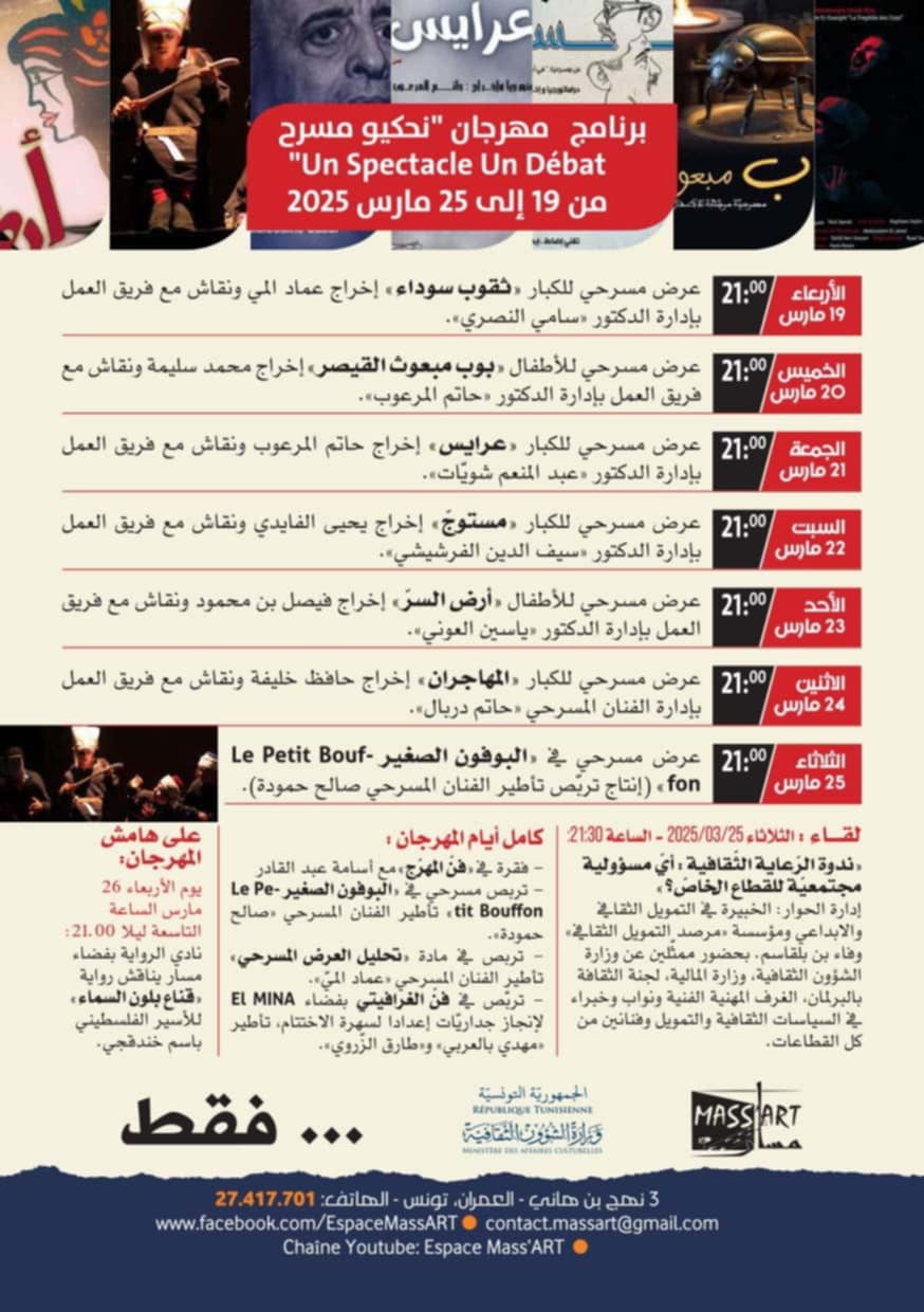 يستعد فضاء مسار للفنون لتنظيم الدورة الثانية من مهرجان "نحكيو مسرح" من 19 إلى 25 مارس 2025، في تجربة فريدة تهدف إلى إثراء الحراك المسرحي عبر عروض مسرحية متميزة، نقاشات مع المبدعين، وورشات تدريبية تهدف إلى تطوير المشهد الفني في تونس.